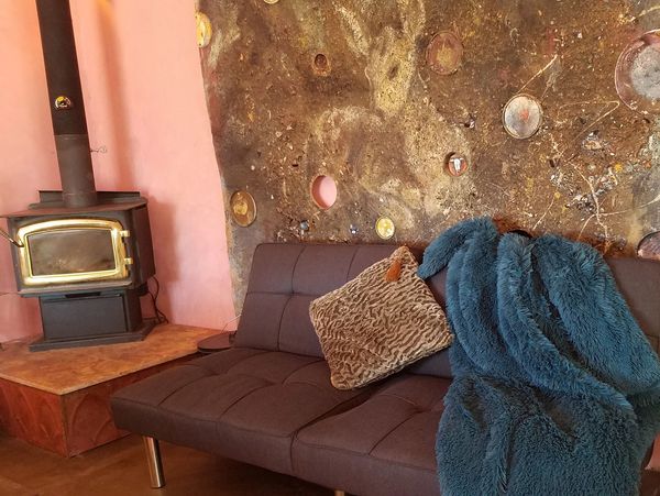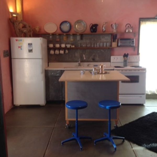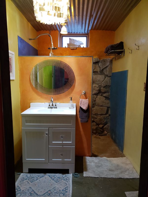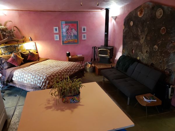 This en-suite room has a fully stocked kitchen, private bathroom with a walk in shower big enough for two, a woodstove for winter evenings, a private covered patio for breakfast, or evenings. Filtered water for drinking. Coffee, tea, oil, spices for cooking.