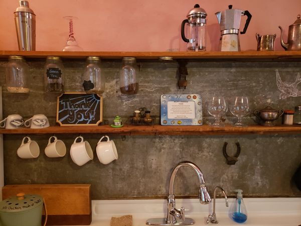 The kitchen was upcycled with a root cellar door as the back splash, and a sink refinished from the old Opera House that was in town.